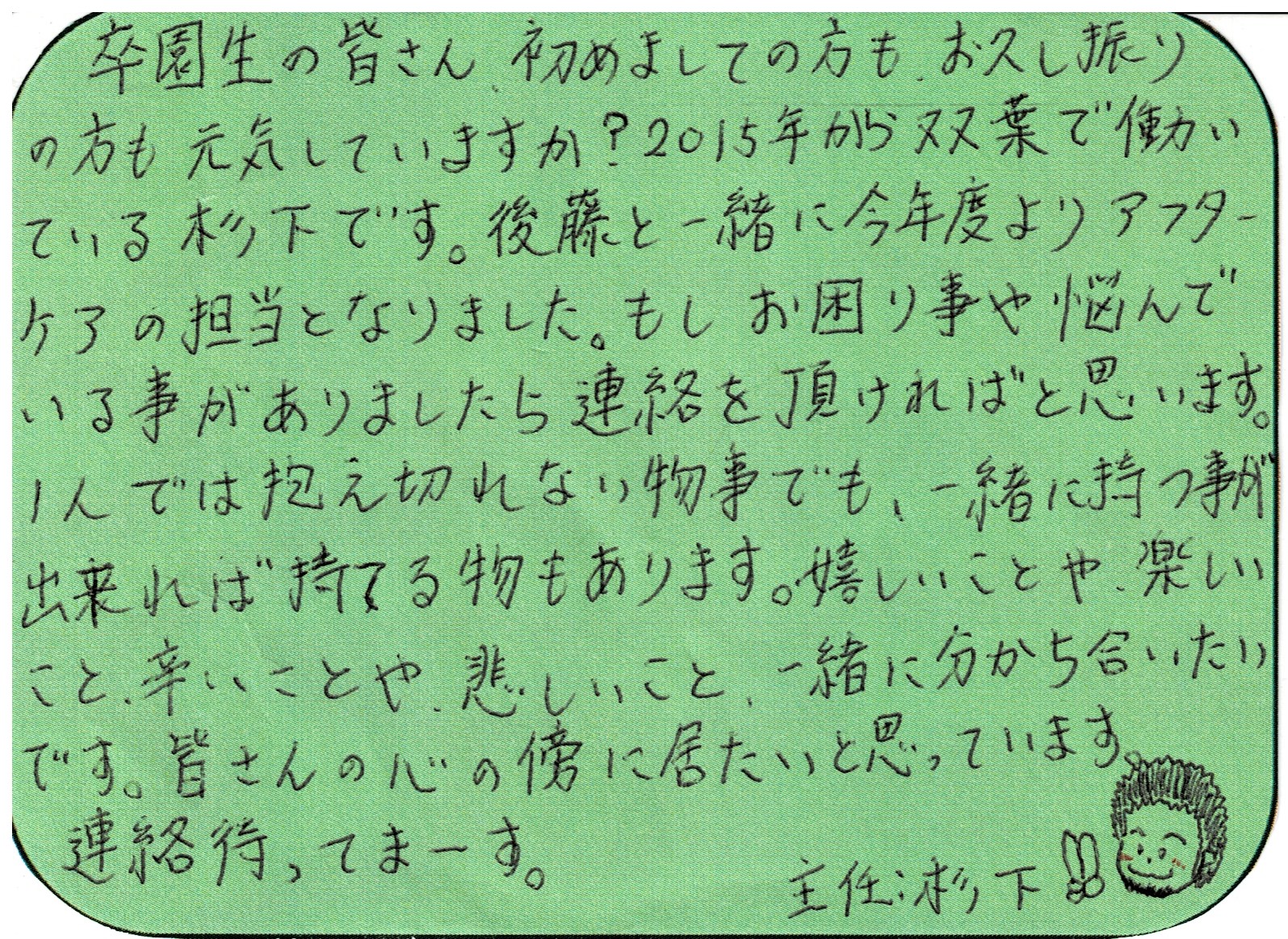 2020/5/23/ / 最終更新日時 : 2025/8/19/ koenkai-f 卒園生のみなさまへ 卒園生のみなさまへ 4 職員からのメッセージ② 職員からのメッセージ第2弾です。 今回撮影したのは、あいにく雨の日で、 ファイトくんは、どれも室内です。 コメントを残す コメントをキャンセルメールアドレスが公開されることはありません。 ※ が付いている欄は必須項目ですコメント ※ 名前 ※ メール ※ サイト 次回のコメントで使用するためブラウザーに自分の名前、メールアドレス、サイトを保存する。