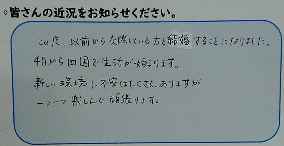 遠く離れた四国での新しい生活、千葉から祝福のエールを送ります。