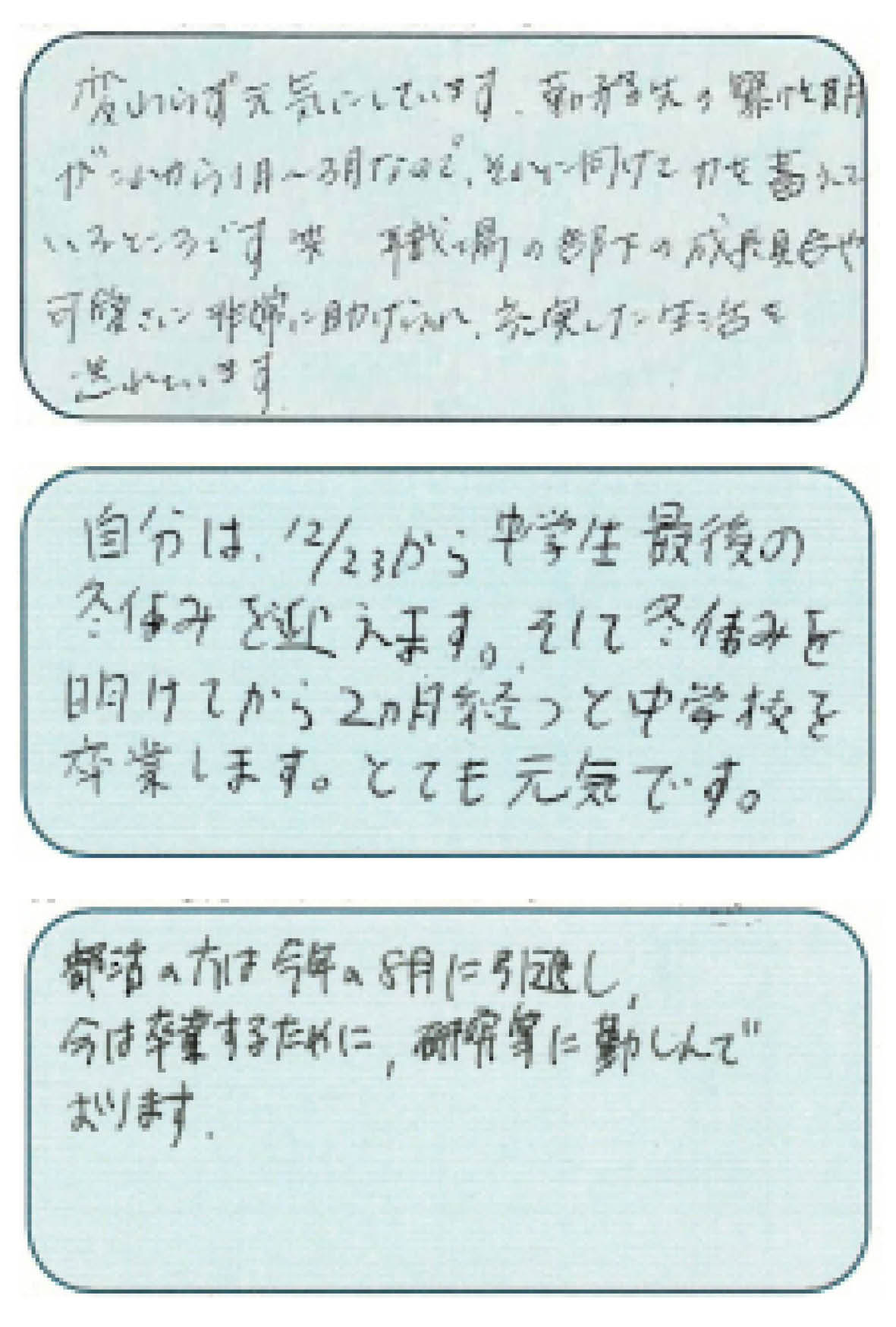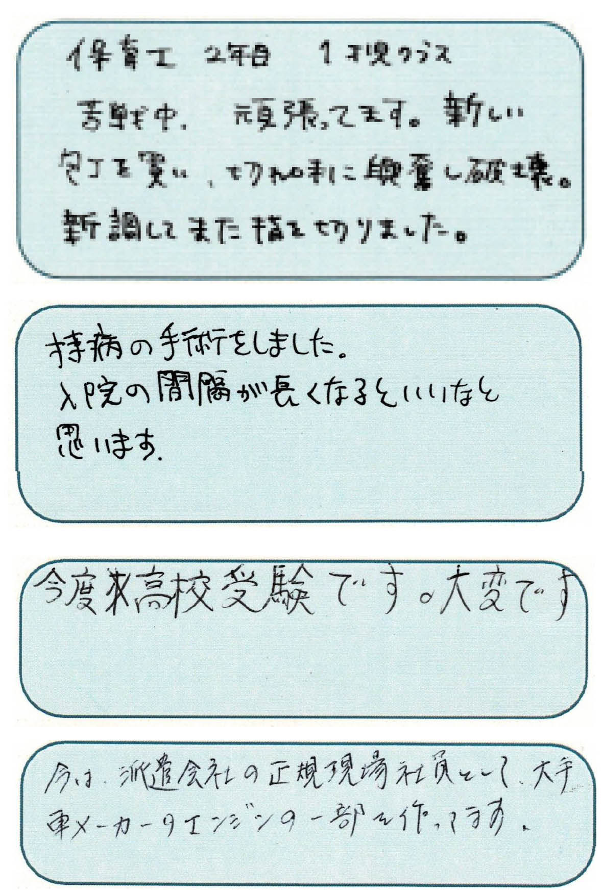 プレゼントを受け取ったたくさんの卒園生、退園生から返信をいただいたので、了承のあった方々の返信を紹介したいと思います。