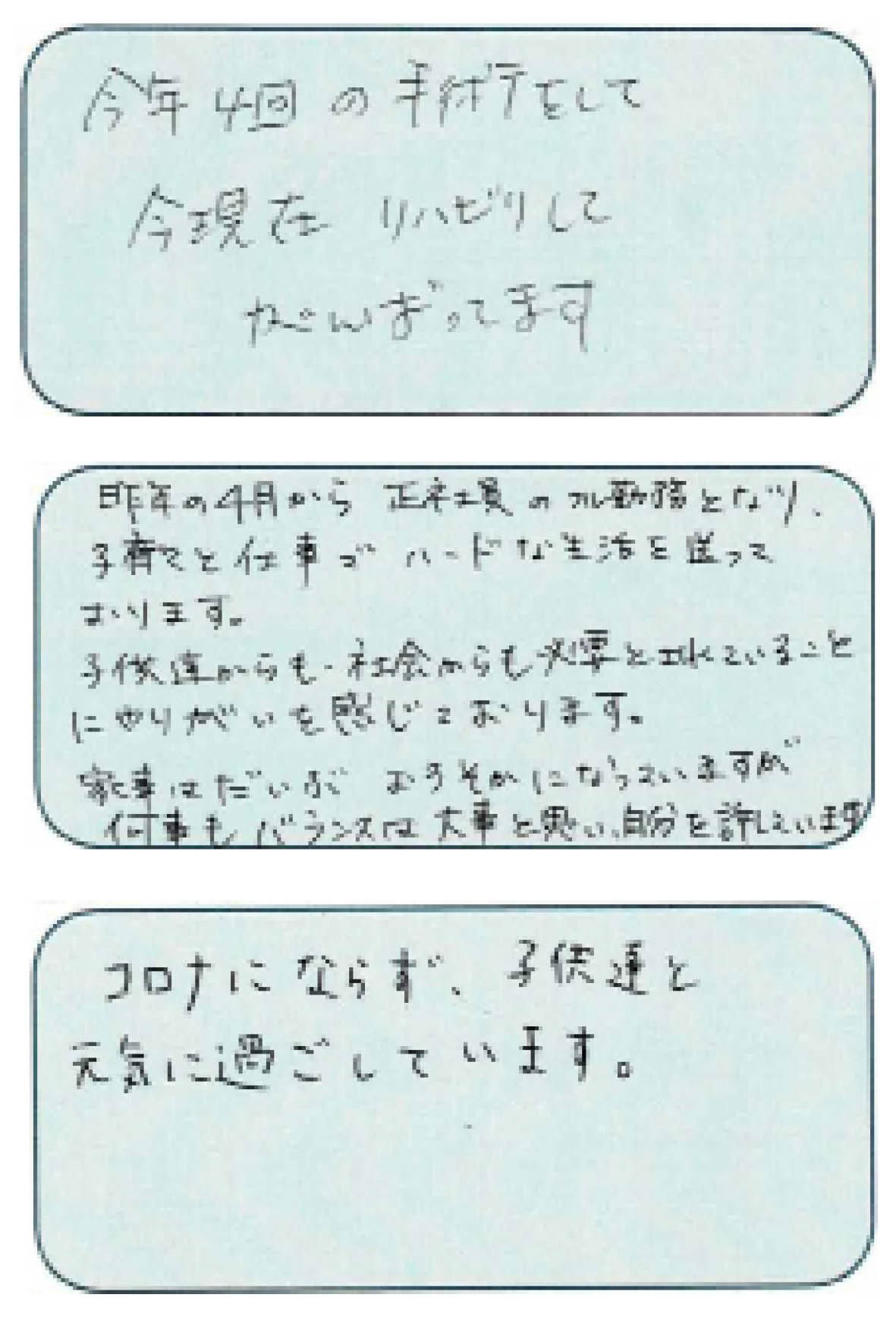 またメッセージを一つひとつ読んで、「もっと私たちにできることはないだろうか。」と感じています。皆さんからのメッセージが私たちの活動の原動力になります。