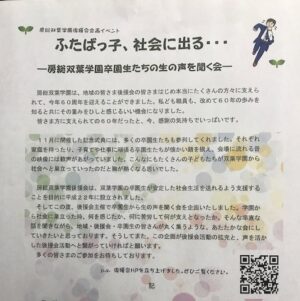 2019/3/6/ / 最終更新日時 : 2025/8/19/ koenkai-f 後援会ニュース 卒園生の語る会を経て、たくさんの皆さんが後援会に入会してくださいました!! お久しぶりです。なかなか更新できずにごめんなさい。 少し前の、1月最後の日曜日、 「ふたばっ子、社会に出る パート2」が開催されました。 寒い日でしたが、たくさんの方々に来ていただきました。 施設の中で働いていると、 つ […]