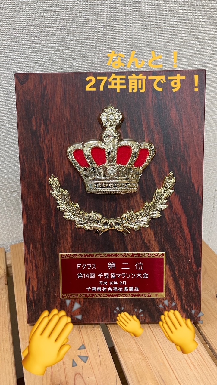 きついマラソン練習のおかげで大会では入賞しました!と大切に保管していた当時の入賞盾を持って来てくれたMさん、